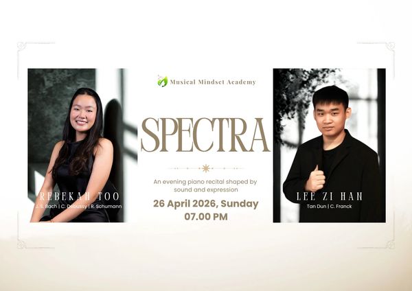 Musical Mindset Academy proudly presents SPECTRA, an evening piano recital shaped by sound and expression, featuring two outstanding young pianists — Rebekah Too and Lee Zi Han.